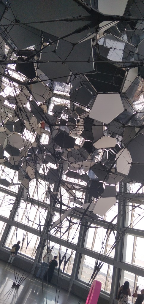 Amb vistes de la ciutat totalment desconegudes. Des d’aquest gran mirador, podem accedir al punt més alt de la torre, a través d’una tela d’aranya, transitable, d’uns 6 kms de cables tensats, suspensa per sobre dels 125 metres d’alçada fins a arribar a superar els 130 metres, per experimentar i “gaudir” pels més agosarats, una altra sensació d’arquitectura urbana especulativa.