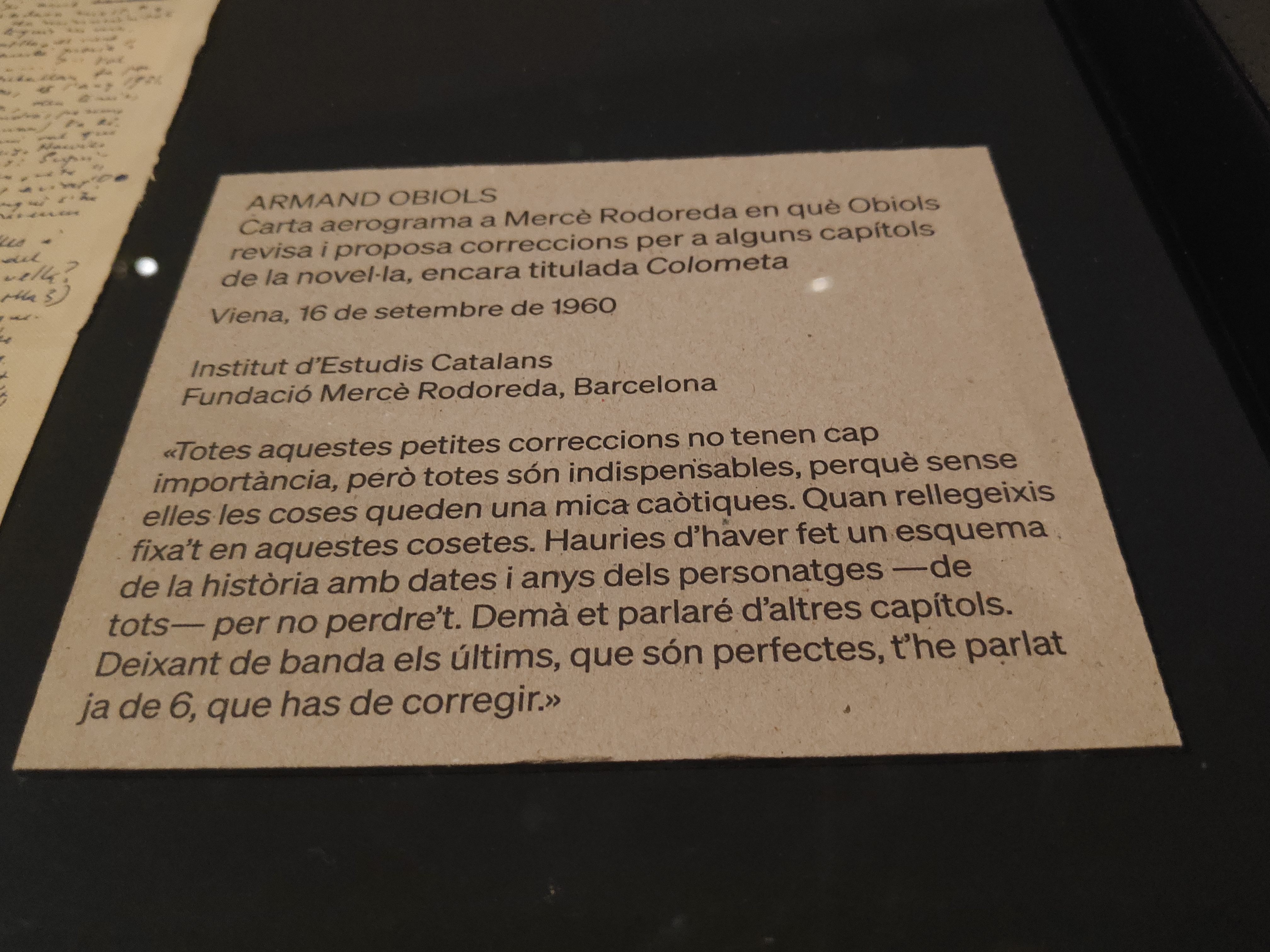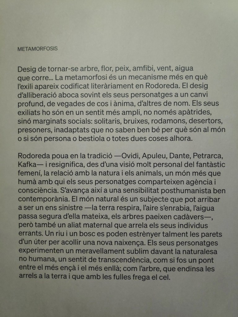 Rodoreda, un bosc és una macro exposició, del millor que he vist sobre una escriptora. S’hi ha d’anar sense presses amb un bon calçat i, sobretot, amb ganes d’entrar a un espai molt íntim, que possiblement recordaràs molt de temps. Són molts els detalls que recordaré, que fins i tot ens han fet riure, per ocurrents. Per citar uns pocs… la documentació original que s’aporta, la seva bibliografia traduïda, les seves inacabables influències literàries, la relació amb altres disciplines artístiques, la documentació filmada…