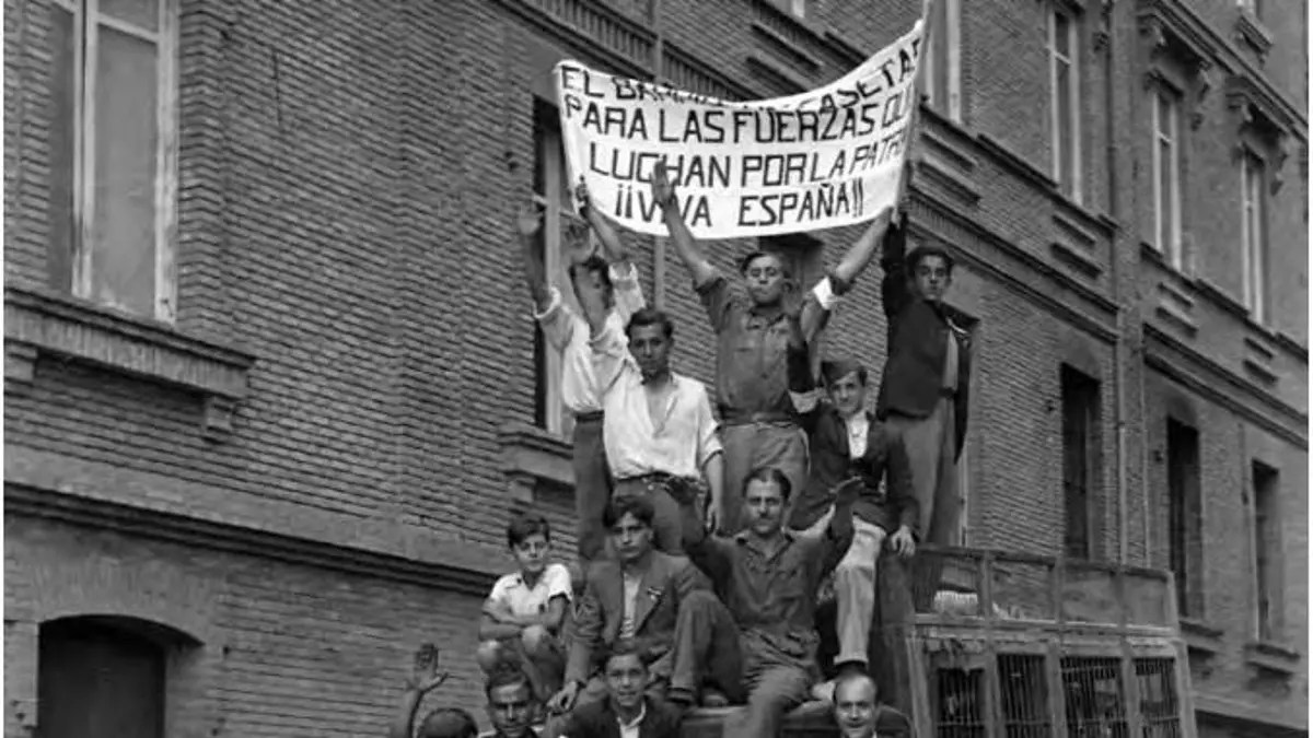 A l’esquerra, voluntaris del bàndol rebel prop de la plaça Constitució de Saragossa (David Alegre) A la dreta, membres d'”Acción Ciudadana” als carrers de Saragossa amb el braçalet blanc que els distingia (AHPZ Coyne)