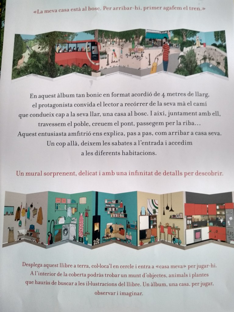 En aquest àlbum únic, en format acordió (de quatre metres de llarg!), el protagonista convida al lector a recórrer de la seva mà el camí que porta a la seva llar, una casa al bosc. Per una de les cares del llibre gegant comença el viatge: travessem el poble, creuem el pont, passegem per la riba del riu… Aquest entusiasta amfitrió ens explica, pas a pas, com arribar a casa seva. Un cop allà, a l’altra cara, deixem les sabates a l’entrada i accedim a les diverses habitacions, dins de les quals hi ha una infinitat de detalls per descobrir. L’exterior i l’interior de la casa es despleguen en aquest àlbum de gran format amb esplèndides il·lustracions, que connecta els primers lectors amb un relat senzill, que convida a posar-se de peu i llegir jugant.