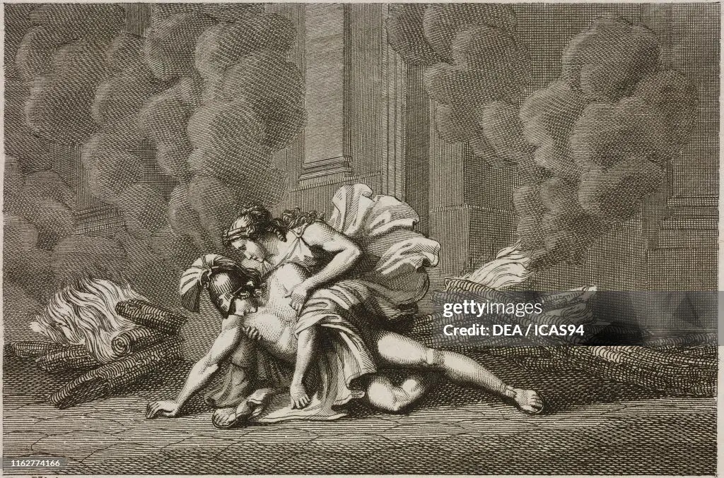 Alcibiades dying in the arms of Timandra, Plate 9, engraving by Persichin from a drawing by Pinelli from Ancient History. Rome, Charles Rollin, 1835